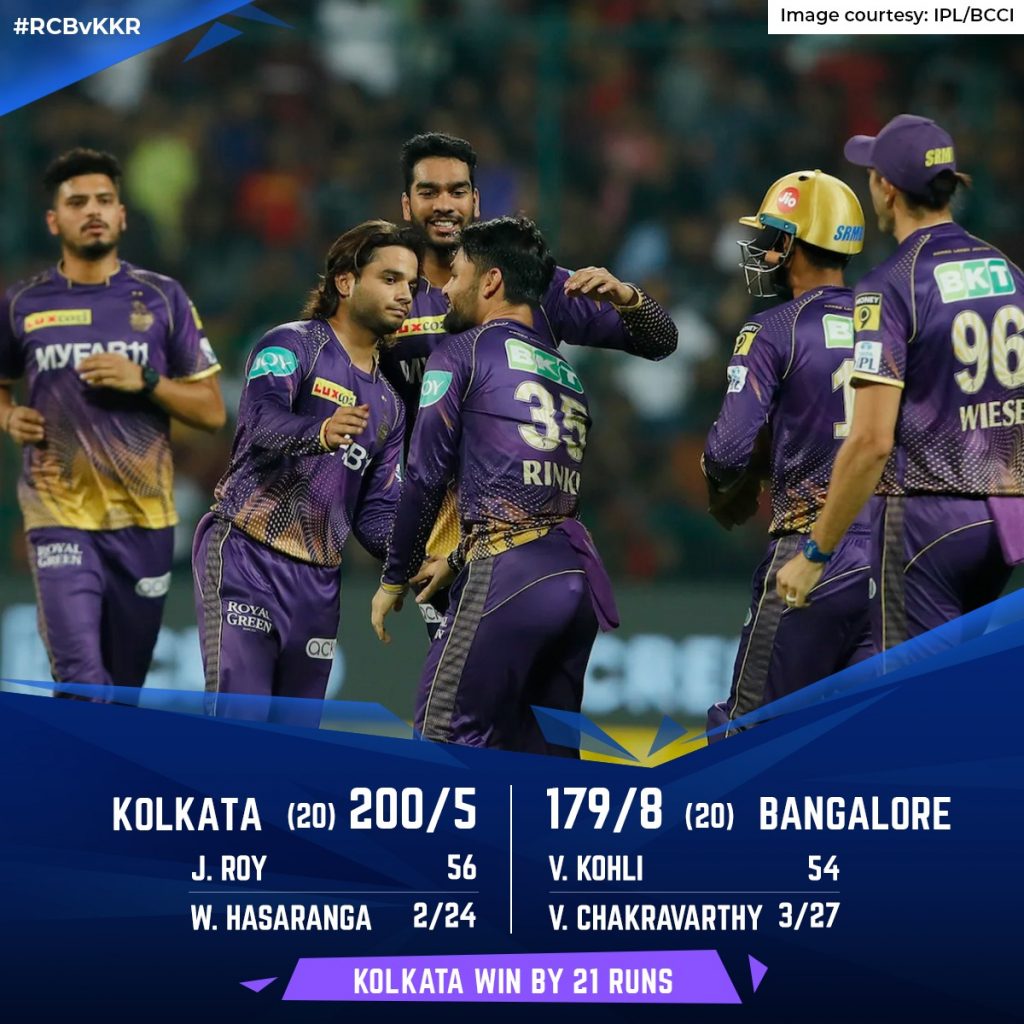 Following their dismissals, no other batter could rise to the occasion for RCB and they could only manage to reach 179/8 in their allotted 20 overs. Varun Chakravarthy (3/27) was the pick of the bowlers for KKR while Suyash Sharma (2/30) and Andre Russell (2/29) picked up two wickets each. As a result, KKR won the match by 21 runs and ended their four-match losing streak.