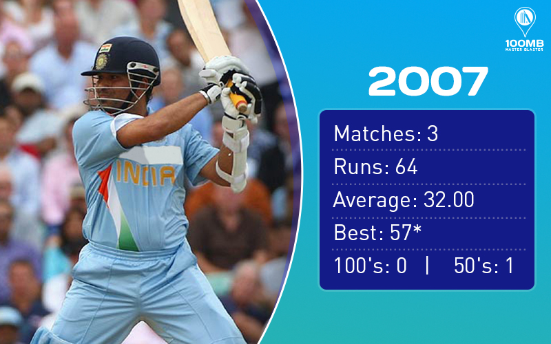 After a loss in the 2003 World Cup final, the Indian team rejuvenated itself in the next few years. The likes of MS Dhoni, Yuvraj Singh, Mohammad Kaif now became an integral part of the team, and India started playing more aggressively. At the age of 34, this turned out to be Sachin’s second last World Cup outing and also the shortest.