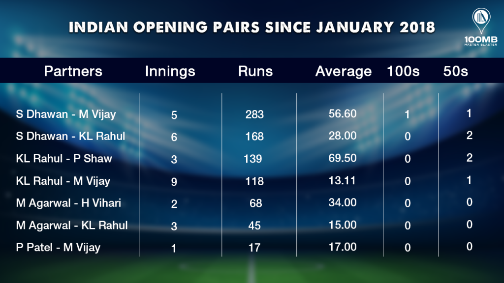 India’s most difficult patch of Test matches began with the tour to South Africa in early 2018. Since then, the Asian giants have used a combination of seven pairs in 29 innings in the subsequent tours of England and Australia. None of them has shown enough potential to retain their places. Murali Vijay and Shikhar Dhawan have both been discarded from the Test side owing to their poor showing. Doping violations have ruled Prithvi Shaw out. The current incumbents, Mayank Agarwal and KL Rahul have not been overly impressive either.