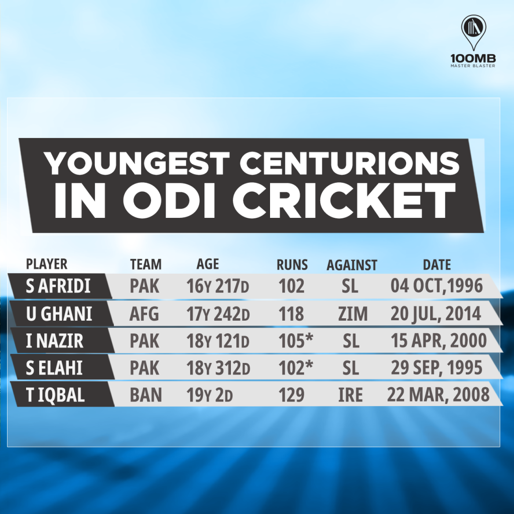 Afridi is followed by Afghanistan’s Usman Ghani who scored his maiden ODI ton at an age of 17 years and 242 days to become the youngest Afghan player and second youngest cricketer in the world to achieve this feat. On July 20, 2014, in a match against Zimbabwe at Bulawayo, Ghani amassed 118 runs off 143 balls including 12 fours and a six.