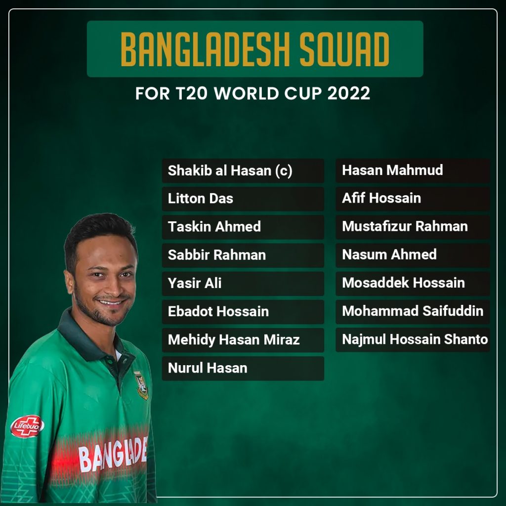Shakib Al Hasan (c), Litton Das, Taskin Ahmed, Sabbir Rahman, Yasir Ali, Ebadot Hossain, Mehidy Hasan Miraz, Nurul Hasan, Hasan Mahmud, Afif Hossain, Mustafizur Rahman, Nasum Ahmed, Mosaddek Hossain, Mohammad Saifuddin, Najmul Hossain Shanto