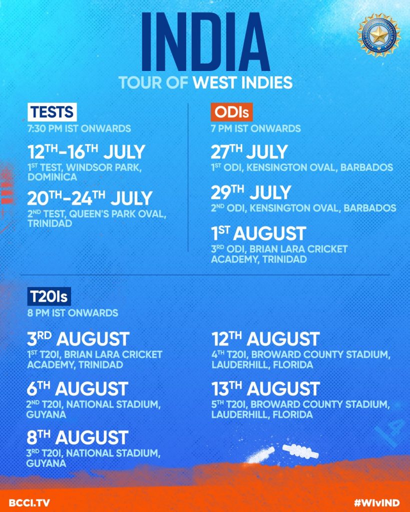 Following a break after the 2023 IPL and the WTC Final against Australia, India is set to engage in a comprehensive series in the West Indies. This series will comprise of two Test matches, three One Day Internationals (ODIs), and three Twenty20 Internationals (T20Is). Additionally, the team will partake in two extra T20Is in Florida. Here is the list of matches.