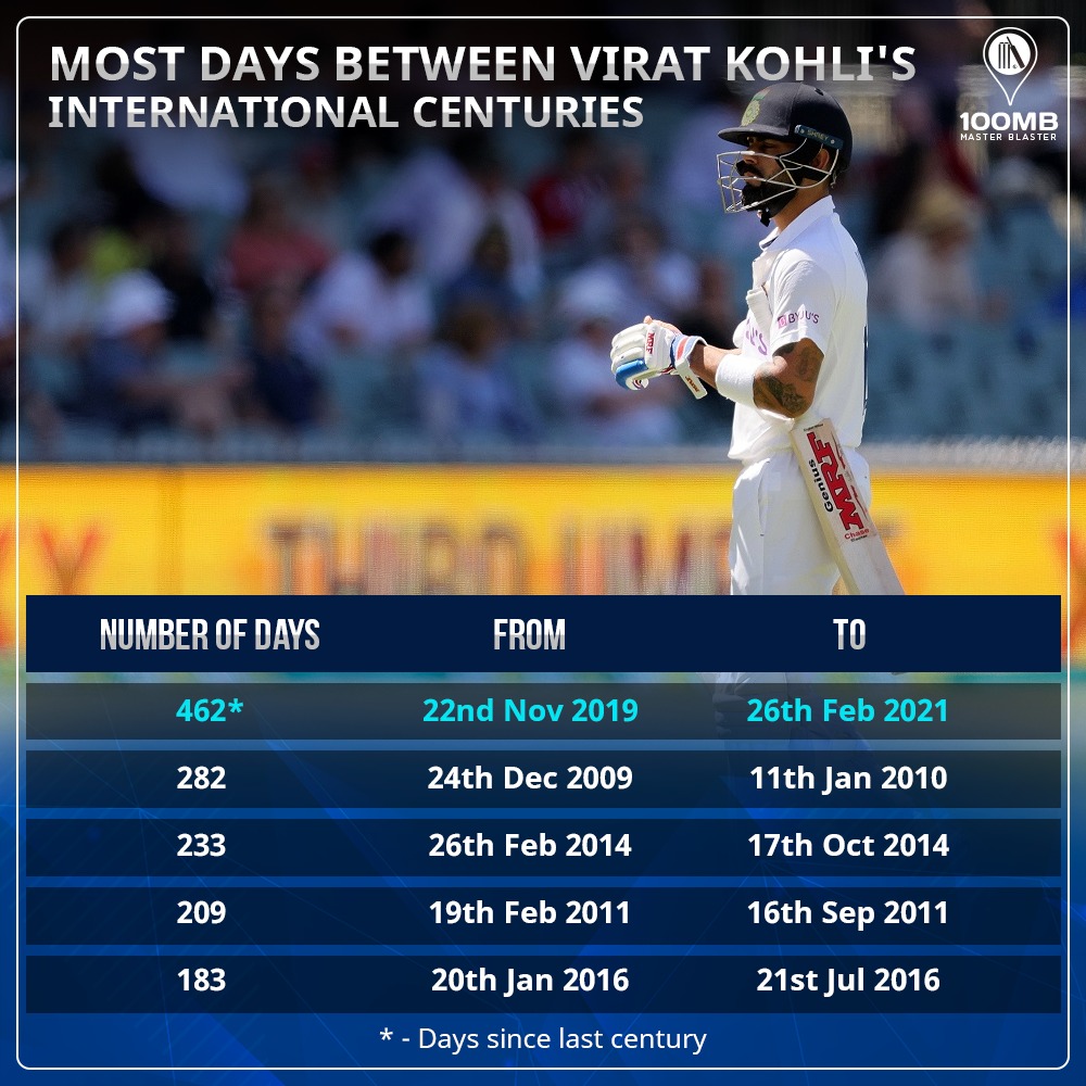As the numbers reveal, this is overwhelmingly the longest Kohli has taken to score a century in international cricket. The second-longest (282 days) gap was between the 2nd and 3rd century when he was finding his feet at the highest level. Of course, the current gap between his centuries also includes the lockdown period which adds a gap of around eight months in India’s fixtures. However, Kohli has had ample opportunities to remove this blemish.