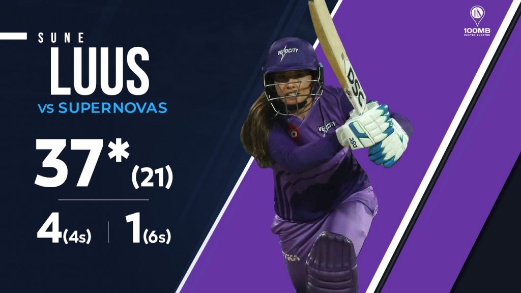 Sune Luus’ match-winning knock – Sune Luus came out to bat with the team struggling at 65/4. Along with Sushma, she first got hold of the conditions and then took toll of the short boundaries in Sharjah. When most of the batters struggled to time the ball in the match, Sune Luus batted with a strike-rate of 176.19 to score an unbeaten 37 off 21 with four fours and a six. She made sure that Velocity crossed the line in the end in a thriller of a game.