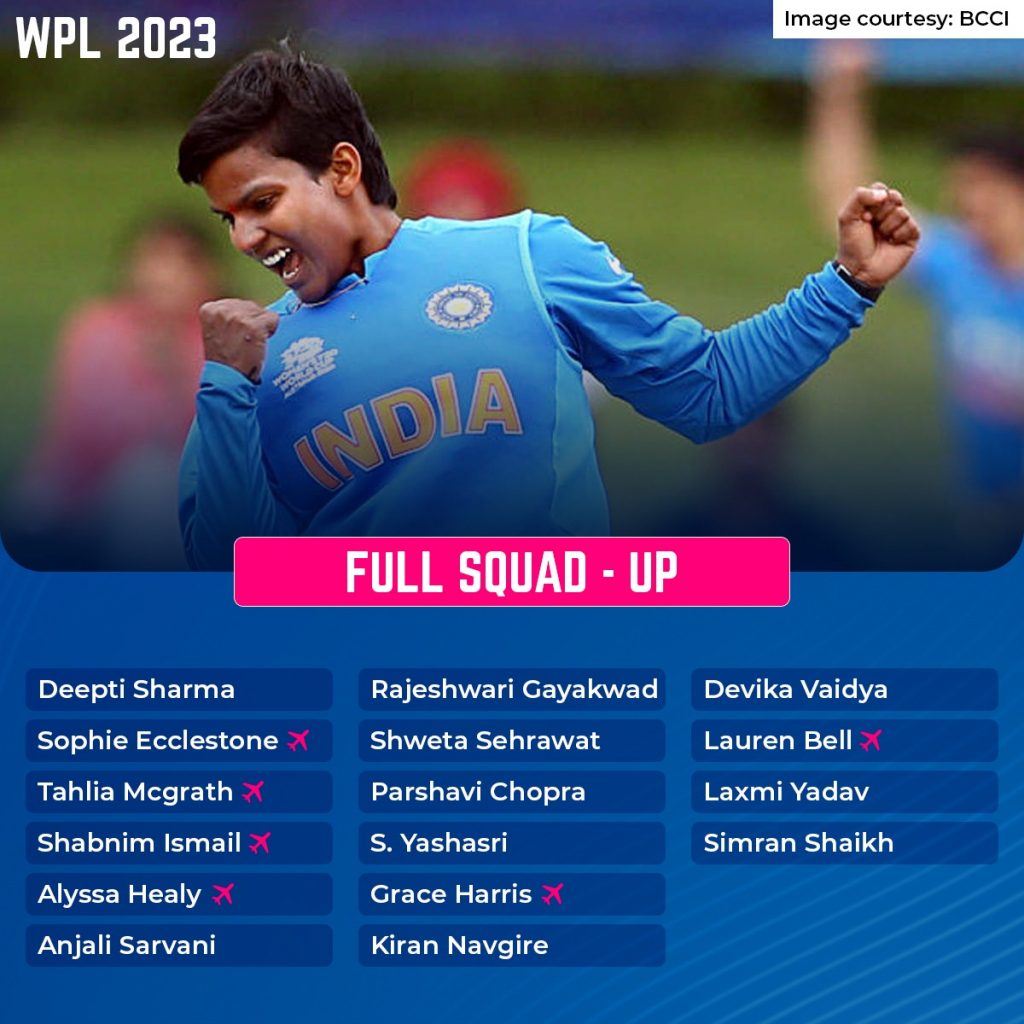UP Warriorz: Sophie Ecclestone, Deepti Sharma, Tahlia McGrath, Shabnim Ismail, Alyssa Healy, Anjali Sarvani, Rajeshwari Gayakwad, Shweta Sehrawat, Soppadhandi Yashasri, Parshavi Chopra, Kiran Navgire, Grace Harris, Devika Vaidya, Lauren Bell, Laxmi Yadav, Simran Shaikh