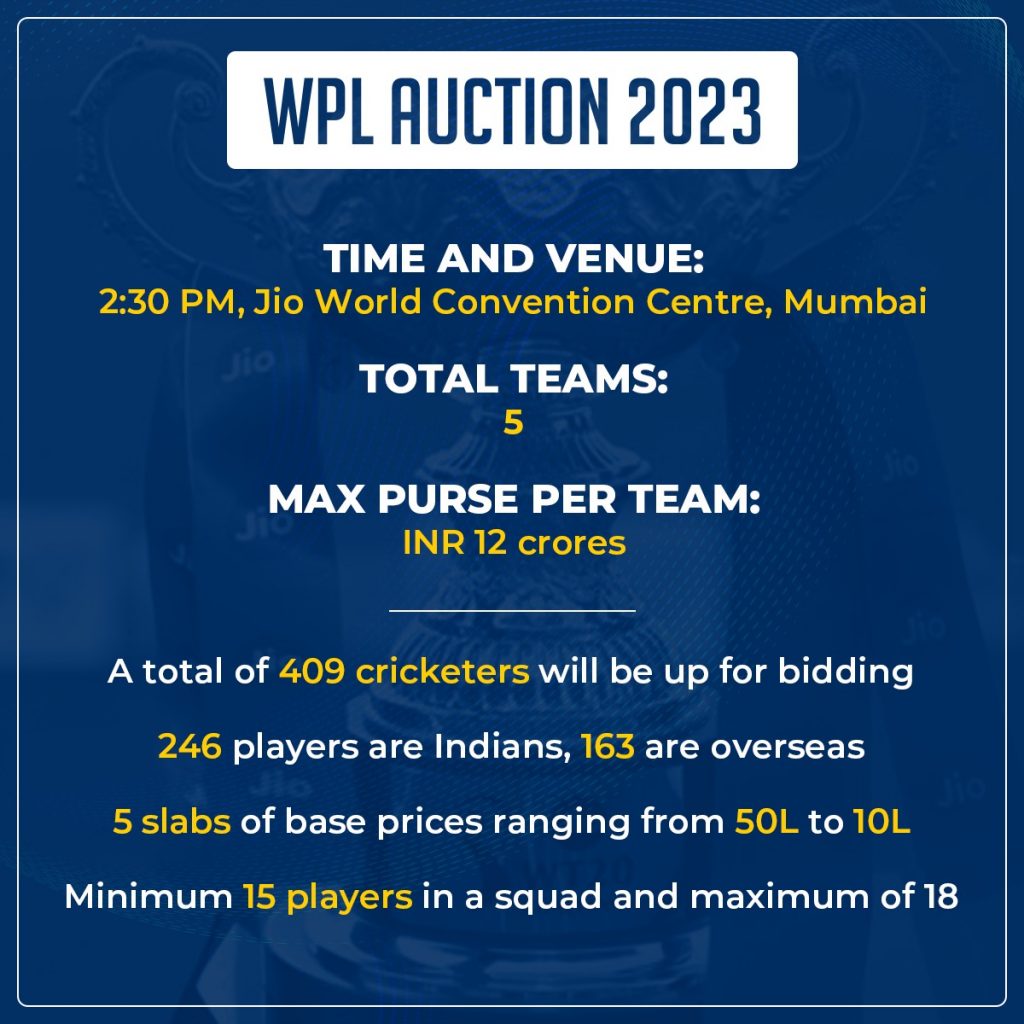 The first-ever auction for the Women’s Premier League is here! The mega event is taking place in the Jio World Convention Centre, Mumbai. Five teams, Mumbai Indians, Delhi Capitals, Royal Challengers Bangalore, Gujarat Giants and UP Warriorz will be building their squad in this exercise. A total of 409 players will be up for bidding. Here are the brief details of the inaugural WPL.