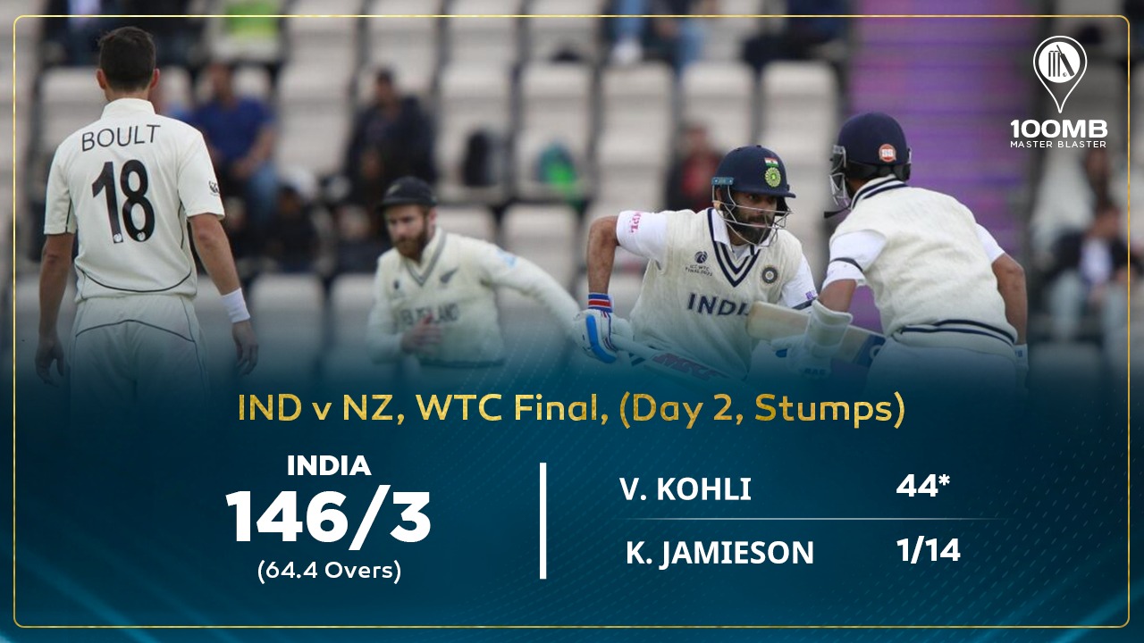 The rain gods showed some mercy on Day 2 of the WTC final between India and New Zealand as 64.4 overs were bowled in the day. At the end of the day, India will be the more pleased side with the way things turned out. The Indian batsmen adopted caution over aggression and went to stumps with their scorecard reading 146/3.